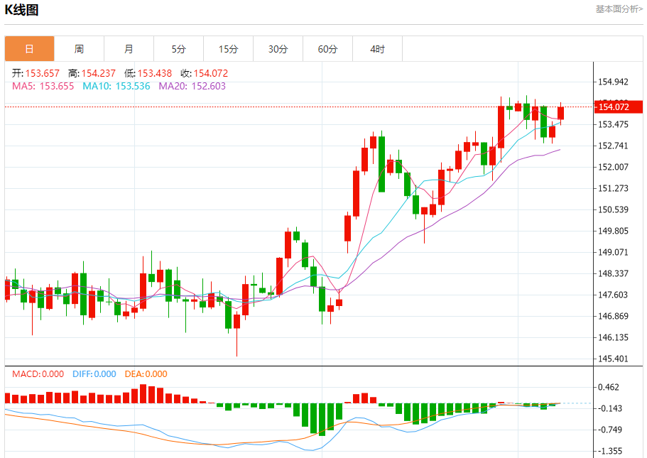 周一盘中,美元/日元报154.045,涨幅0.41%。 今日分析:在153.50之上,看涨,目标价位为154.35,然后为154.60。 技术点评:RI技术指标呈现继续上升趋势。 支撑位:153.50153.30153.00 阻力位:154.90154.60154.35 (亚汇网编辑:冰凡)