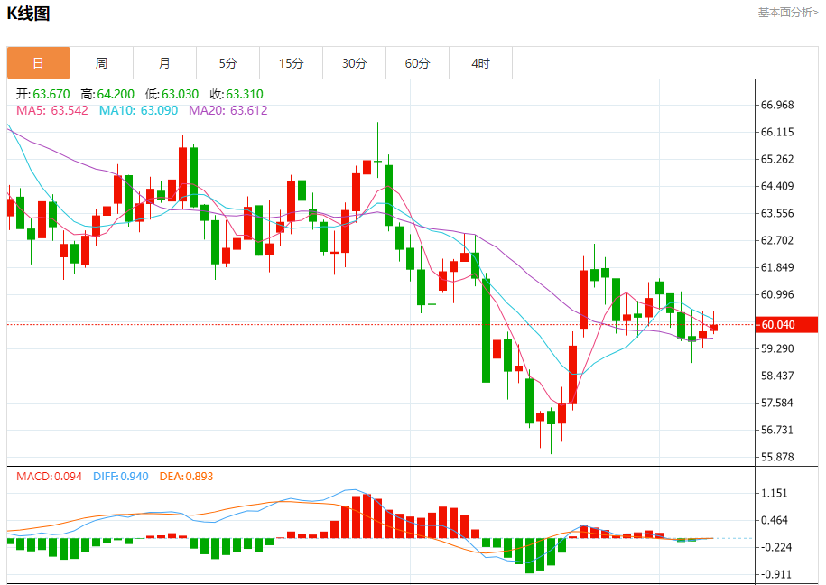 周一盘中,WTI原油报60.030,涨幅0.49%。 今日分析:在59.75之上,看涨,目标价位为60.80,然后为61.10。 技术点评:即使我们不能排除持续调整的可能性,其时间长度上,应该是有限的。 支撑位:59.7559.3058.80 阻力位:61.4061.1060.80 (亚汇网