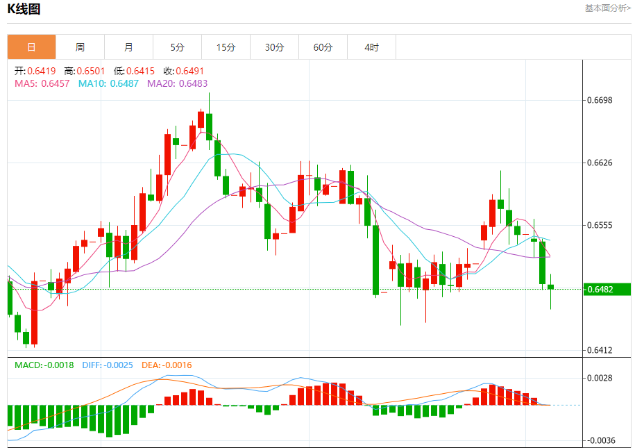今日周三,澳元兑美元报0.6484,跌幅0.07%;美元兑加元报1.4134,涨幅0.22%;美元兑瑞郎报0.8110,涨幅0.10%。 澳元兑美元汇率分析 技术点评:只要依旧存在0.6500阻力位,很可能下跌至0.6445。 阻力位:0.65350.65150.6500 支撑位:0.64450.64250.6405