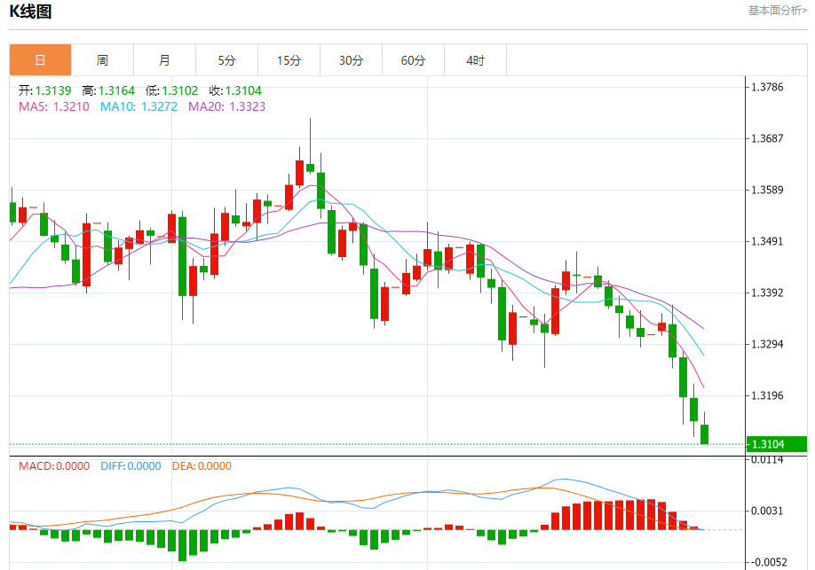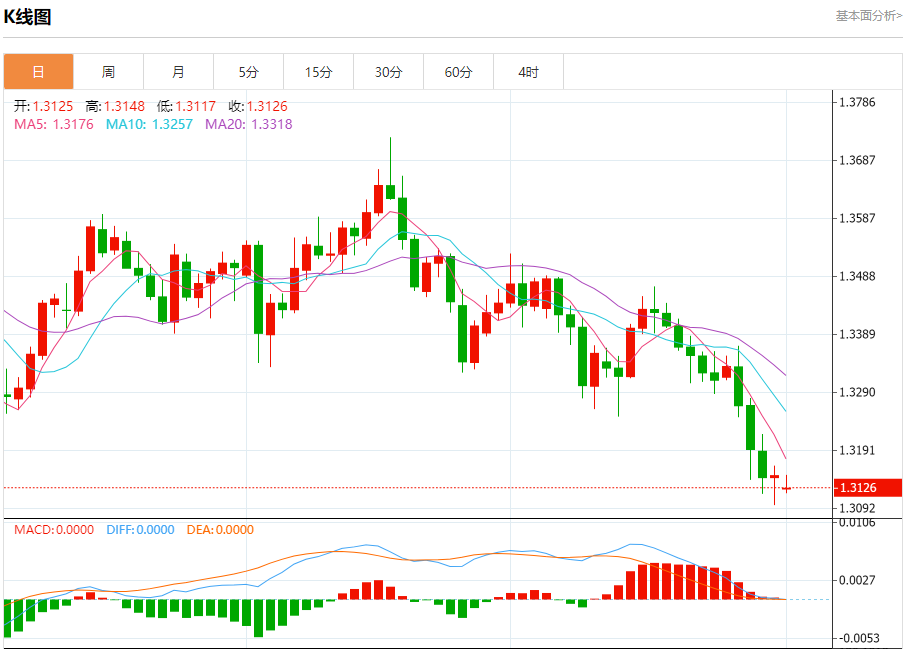 周五盘中,英镑/美元报1.3112,跌幅0.26%。 今日分析:在1.3155之下,看跌,目标价位为1.3115,然后为1.3095。 技术点评:RI技术指标运行趋势复杂,倾向于下降。 支撑位:1.31151.30951.3070 阻力位:1.32151.31801.3155 (亚汇网编辑:冰凡)
