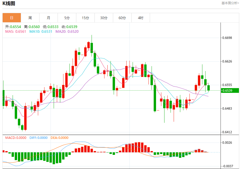 今日周五,澳元兑美元报0.6540,跌幅0.24%;美元兑加元报1.4029,涨幅0.31%;美元兑瑞郎报0.8040,涨幅0.25%。 澳元兑美元汇率分析 技术点评:只要0.6560阻力位不被突破,向下跌破0.6520位置的风险很高。 阻力位:0.65950.65800.6560 支撑位:0.65200.65050.649