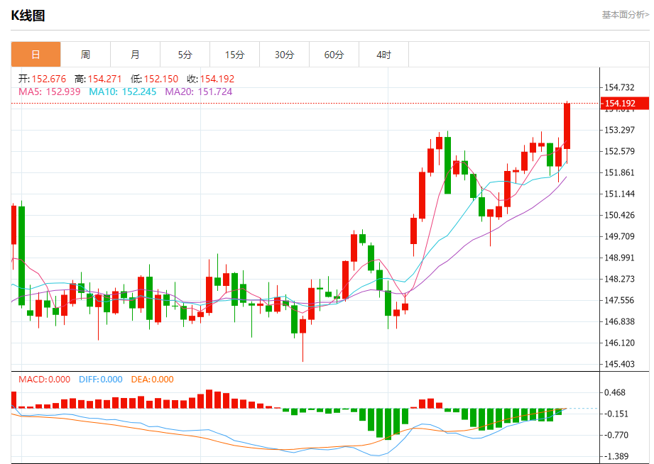 周四盘中,美元/日元报154.233,涨幅0.98%。 今日分析:在153.00之上,看涨,目标价位为154.20,然后为154.80。 技术点评:在153.00之上,为多头信号,向上的目标位为154.20。 支撑位:153.00152.50152.15 阻力位:155.00154.80154.20 (亚汇网编