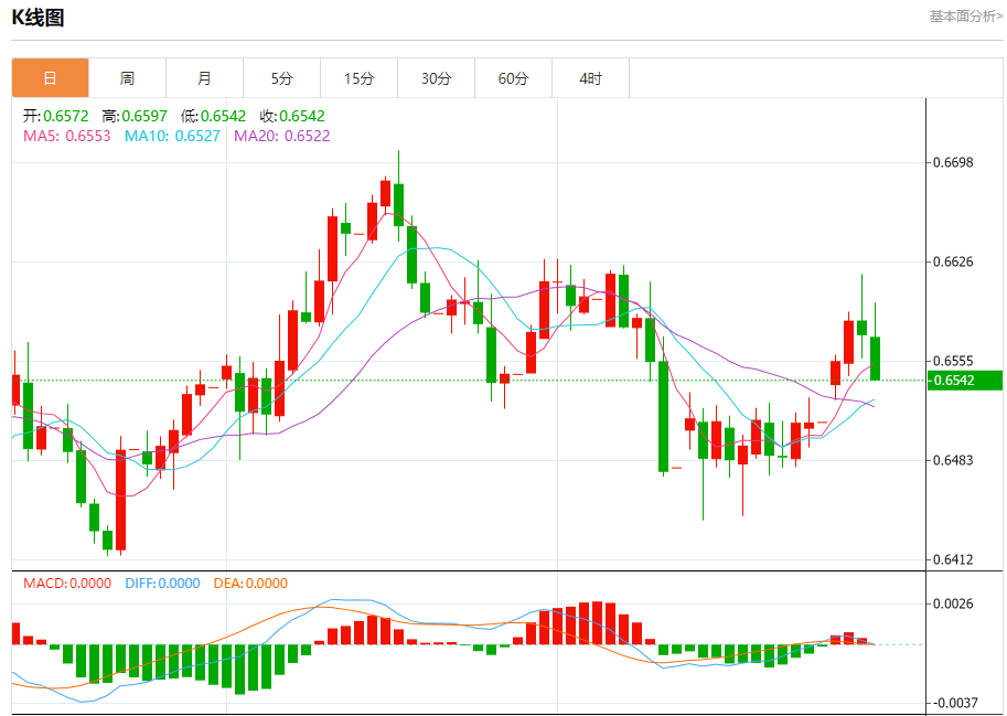 今日周四,澳元兑美元报0.6543,跌幅0.49%;美元兑加元报1.3998,涨幅0.39%;美元兑瑞郎报0.8027,涨幅0.42%。 澳元兑美元汇率分析 技术点评:只要依旧存在0.6595阻力位,价格波动存在看跌的趋势。 阻力位:0.66300.66150.6595 支撑位:0.65450.65300.6515