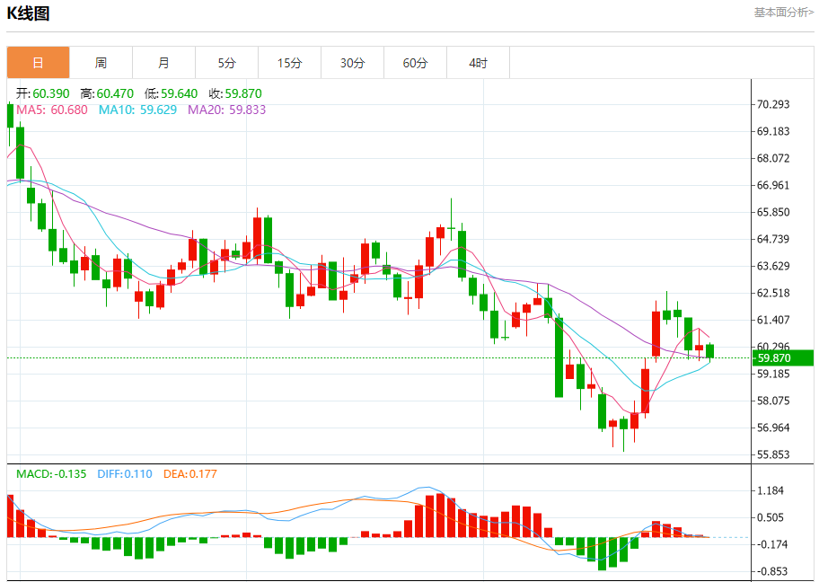周四盘中,WTI原油报59.850,跌幅1.04%。 今日分析:在60.65之下,看跌,目标价位为59.70,然后为59.35。 技术点评:只要依旧存在60.65阻力位,价格波动存在看跌的趋势。 支撑位:59.7059.3558.85 阻力位:61.3061.0060.65 (亚汇网编辑:冰凡)