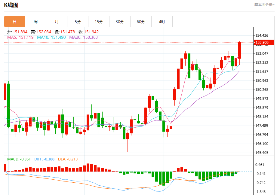 今日周四,截止目前美元兑日元报153.939,上涨0.79%。 日元基本面行情分析 日本央行周四(10月30日)维持基准利率在0.5%不变,连续第六次按兵不动。此次央行会议是高市早苗本月出任日本首相后举行的首次央行会议。 该行此次决策以7票赞成、2票反对的结果通过,反对票来自两位