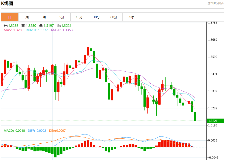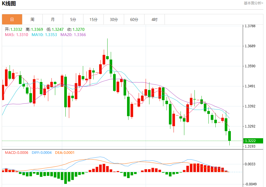周三盘中,英镑/美元报1.3217,跌幅0.38%。 今日分析:在1.3280之下,看跌,目标价位为1.3150,然后为1.3100。 技术点评:RI技术指标运行趋势复杂,应谨慎操作。 支撑位:1.31501.31001.3030 阻力位:1.33251.33001.3280 (亚汇网编辑:冰凡)