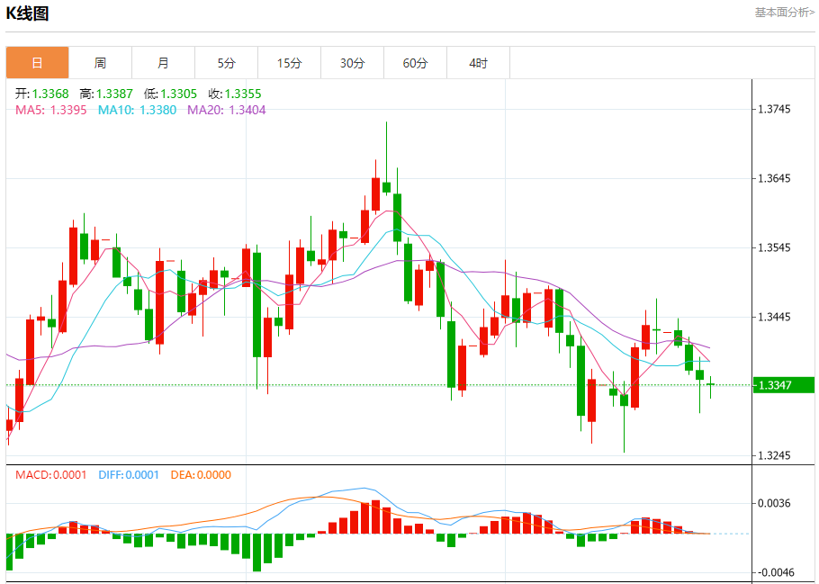周四盘中,英镑/美元报1.3349,跌幅0.04%。 今日分析:看涨,当1.3328为支撑位。 技术点评:RI技术指标大于中性区域50。ACD技术指标处在其信号线之上看多。配置为正。此外,价位高于其20天及50天移动平均线(分别位于1.3343和1.3355)。 支撑位:1.33281.32941.3274