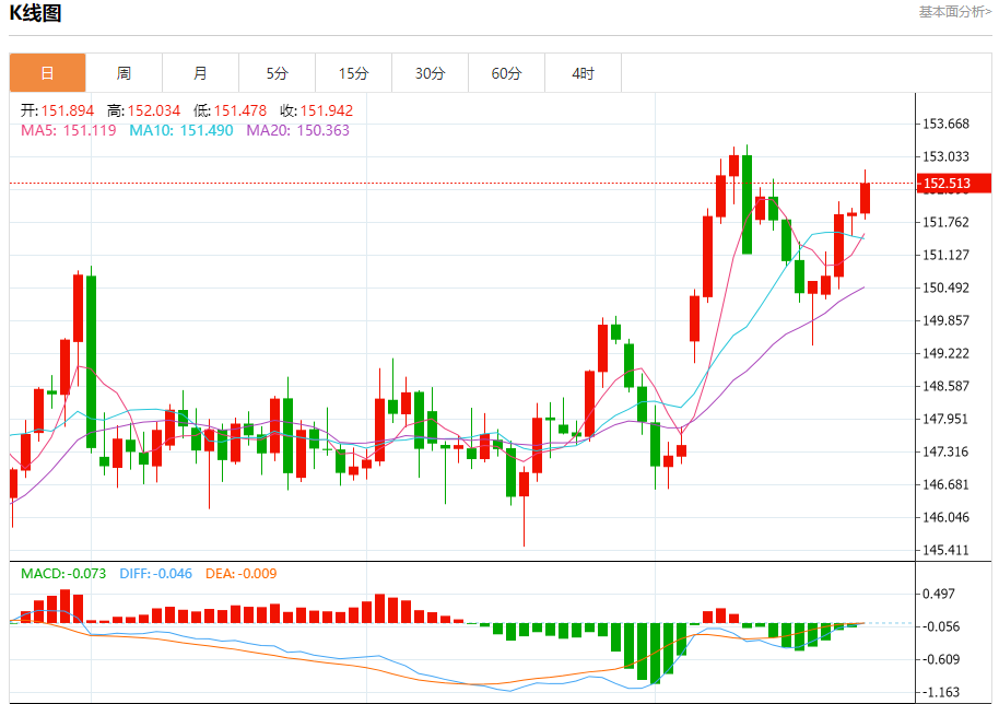 周四盘中,美元/日元报152.541,涨幅0.38%。 今日分析:调整至151.27处,在反弹上升之前。 技术点评:RI技术指标大于中性区域50。ACD技术指标处在其信号线之下看空。RI突破50应该会触发进一步的损失。此外,价位高于其20天及50天移动平均线(分别位于151.82和151.81)。