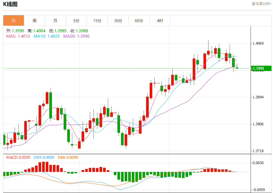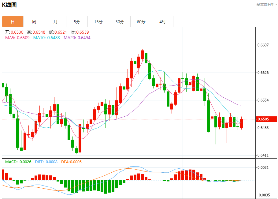 今日周四,澳元兑美元报0.6507,涨幅0.30%;美元兑加元报1.3990,跌幅0.04%;美元兑瑞郎报0.7971,涨幅0.16%。 澳元兑美元汇率分析 技术点评:RI技术指标小于中性区域50。ACD技术指标处在其信号线之下看空。配置为负。此外,价位低于其20天及50天移动平均线(分别位于0.6490和0.6493)。
