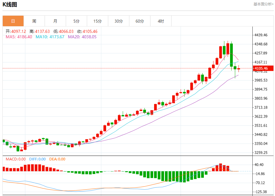 行情回顾 截至10月23日19时24分,国际黄金期货(纽约金)价格为4127.2美元/盎司,较前一交易日上涨61.8美元,涨幅1.52%,最高达到4152.9美元/盎司,最低为4079.6美元/盎司。国际黄金现货(伦敦金现)价格为4113.65美元/盎司,上涨26.14美元,涨幅0.64%,最高4137.35美元/盎司,最低4065.47美元/盎司。