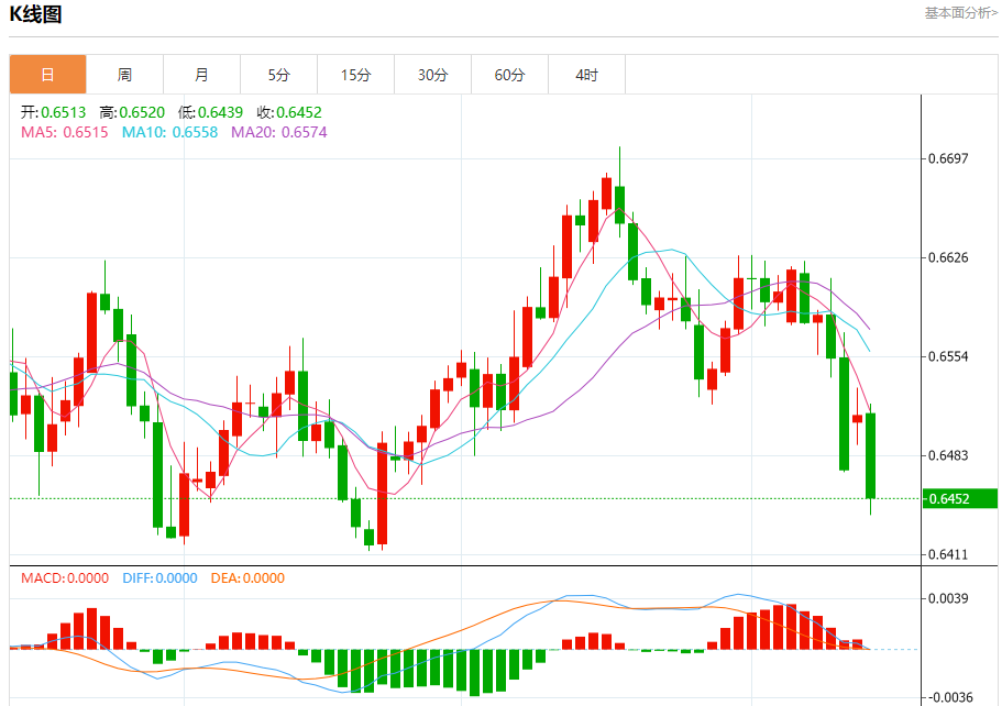 今日周二,澳元兑美元报0.6454,跌幅0.92%;美元兑加元报1.4051,涨幅0.10%;美元兑瑞郎报0.8030,跌幅0.16%。 澳元兑美元汇率分析 技术点评:跌破0.6435位置,将会引发下跌至0.6410。 阻力位:0.65250.65050.6490 支撑位:0.64350.64100.6395 美
