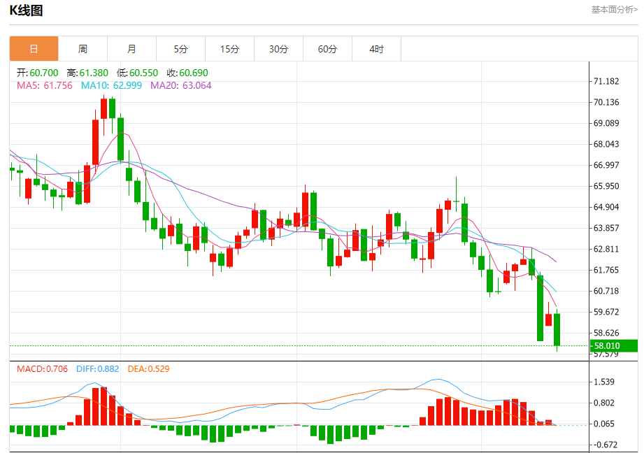 周二盘中,WTI原油报58.020,跌幅2.47%。 今日分析:在59.00之下,看跌,目标价位为57.60,然后为57.00。 技术点评:投资者应保持谨慎操作,由于这些支撑或阻力位可能引发套现。 支撑位:57.6057.0056.50 阻力位:60.3059.6059.00 (亚汇网编辑: