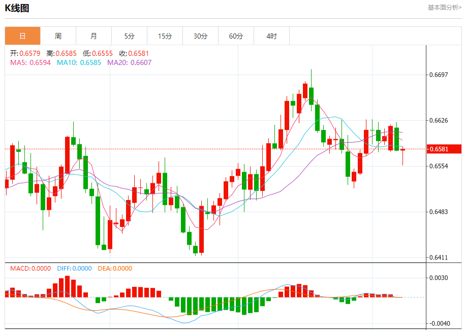 今日周三,澳元兑美元报0.6584,涨幅0.04%;美元兑加元报1.3934,跌幅0.12%;美元兑瑞郎报0.8003,涨幅0.26%。 澳元兑美元汇率分析 技术点评:RI技术指标呈现进一步向下趋势。 阻力位:0.66200.66000.6585 支撑位:0.65450.65300.6515 美元兑加元