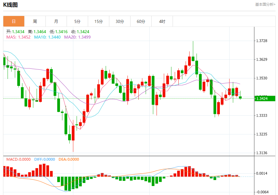 周一盘中,英镑/美元报1.3437,跌幅0.30%。 今日分析:在1.3465之下,看跌,目标价位为1.3400,然后为1.3385。 技术点评:只要依旧存在1.3465阻力位,价格波动存在看跌的趋势。 支撑位:1.34001.33851.3370 阻力位:1.35001.34851.3465 (亚汇网编