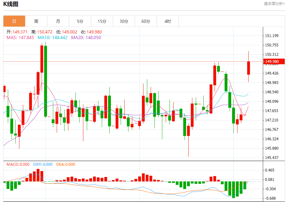 周一盘中,美元/日元报149.781,涨幅1.59%。 今日分析:在149.60之上,看涨,目标价位为150.80,然后为151.50。 技术点评:RI技术指标缺乏下降动能 支撑位:149.60149.05148.55 阻力位:152.00151.50150.80 (亚汇网编辑:冰凡)