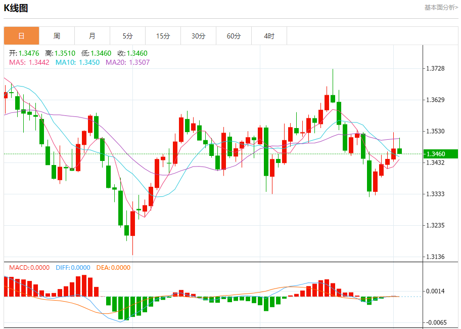 周四盘中,英镑/美元报1.3456,跌幅0.13%。 今日分析:在1.3455之上,看涨,目标价位为1.3525,然后为1.3560。 技术点评:即使我们不能排除持续调整的可能性,其时间长度上,应该是有限的。 支撑位:1.34551.34351.3410 阻力位:1.35801.35601.3525