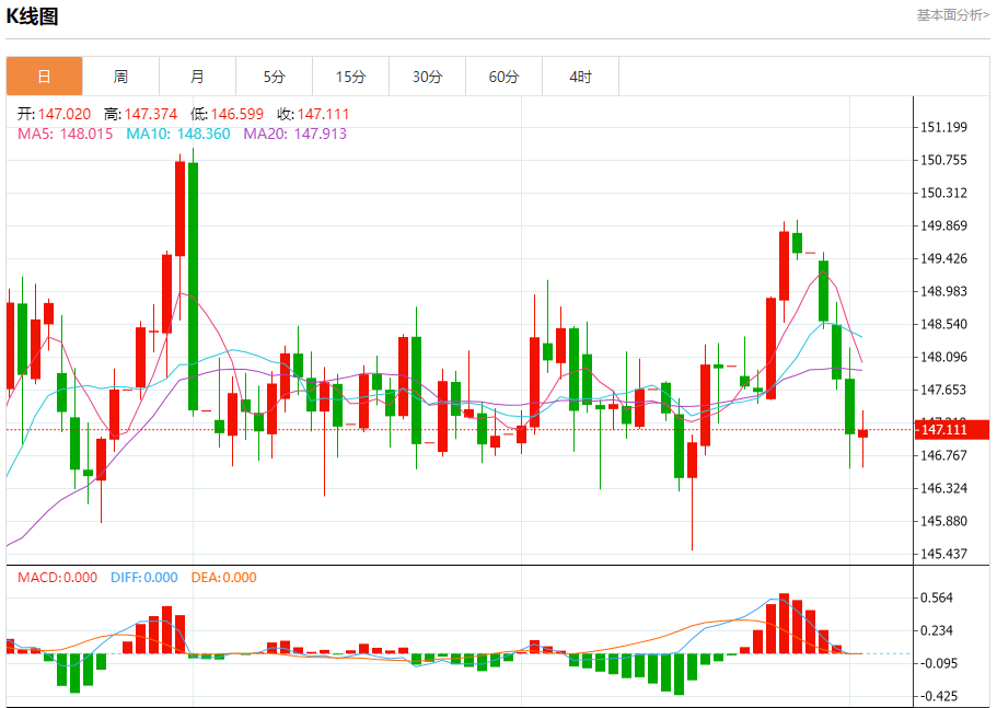 周四盘中,美元/日元报147.113,涨幅0.04%。 今日分析:在147.25之下,看跌,目标价位为146.30,然后为145.85。 技术点评:RI技术指标上,呈现下跌趋势。 支撑位:146.30145.85145.45 阻力位:147.90147.65147.25 (亚汇网编辑:冰凡)