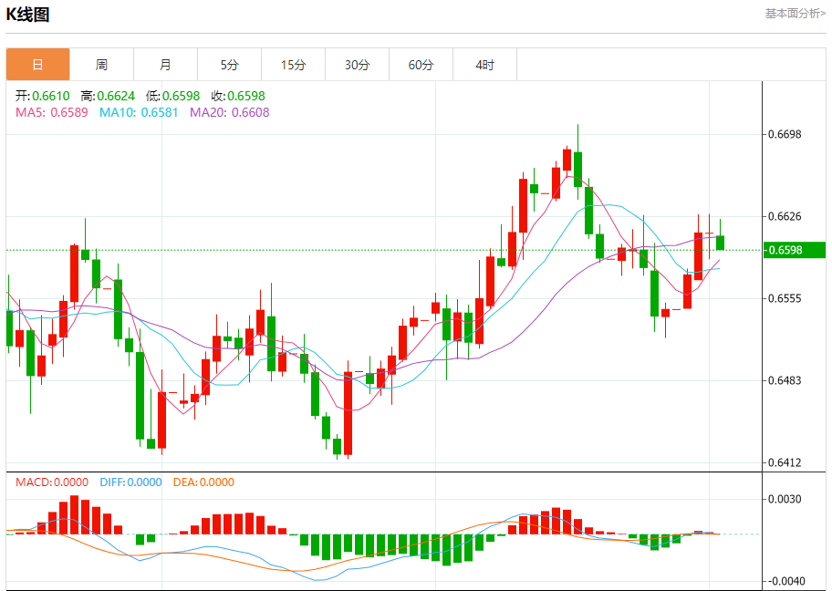 今日周四,澳元兑美元报0.6600,跌幅0.21%;美元兑加元报1.3953,涨幅0.13%;美元兑瑞郎报0.7978,涨幅0.09%。 澳元兑美元汇率分析 技术点评:超短线(当日内)技术指标缺乏动能 阻力位:0.66600.66500.6630 支撑位:0.65950.65750.6560 美元兑加