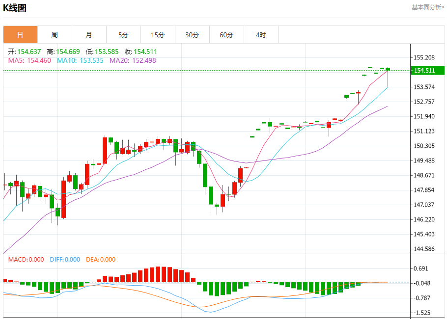 周五盘中,美元/日元报154.523,跌幅0.08%。 今日分析:在153.90之上,看涨,目标价位为154.65,然后为155.00。 技术点评:RI技术指标向上运行。 支撑位:153.90153.55153.20 阻力位:155.25155.00154.65 (亚汇网编辑:冰凡)