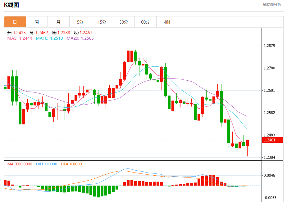 周五盘中,英镑/美元报1.2462,涨幅0.20%。 今日分析:在1.2400之上,看涨,目标价位为1.2460,然后为1.2480。 技术点评:RI技术指标运行趋势复杂,倾向于上涨。 支撑位:1.24001.23851.2370 阻力位:1.25001.24801.2460 (亚汇网编辑:冰凡)