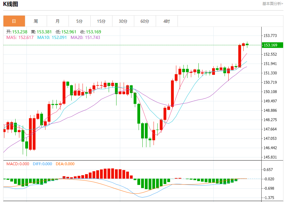 周五盘中,美元/日元报153.181,跌幅0.06%。 今日分析:在152.95之上,看涨,目标价位为153.60,然后为153.80。 技术点评:RI技术指标运行趋势复杂,倾向于上涨。 支撑位:152.95152.75152.50 阻力位:154.00153.80153.60 (亚汇网编辑:冰凡)
