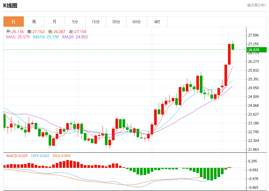 周四盘中,现货白银报26.960,跌幅0.72%。 今日分析:在26.65之上,看涨,目标价位为27.33,然后为27.80。 技术点评:RI技术指标运行趋势复杂,倾向于上涨。 支撑位:26.6526.2025.90 阻力位:28.0027.8027.33 (亚汇网编辑:冰凡)