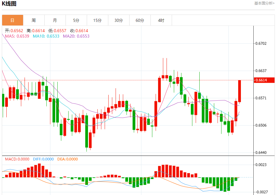 今日周四,澳元兑美元报0.6615,涨幅0.76%;美元兑加元报1.3484,跌幅0.32%;美元兑瑞郎报0.9053,涨幅0.25%。 澳元兑美元汇率分析 技术点评:RI技术指标向上运行。 阻力位:0.66650.66400.6620 支撑位:0.65550.65400.6520 美元兑加元汇率分析