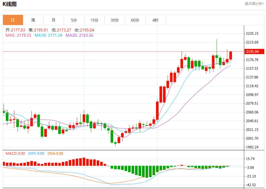 周三盘中,现货黄金报2187.35,涨幅0.41%。 今日分析:在2182.00之上,看涨,目标价位为2200.00,然后为2211.00。 技术点评:RI技术指标看涨,有进一步上升空间。 支撑位:2182.002174.002169.00 阻力位:2222.002211.002200.00 (亚汇网编辑:冰