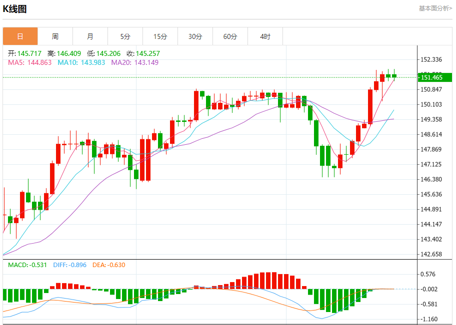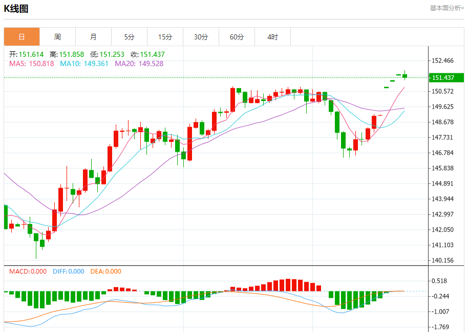 周五盘中,美元/日元报151.447,跌幅0.11%。 今日分析:在151.15之上,看涨,目标价位为151.85,然后为152.30。 技术点评:即使我们不能排除持续调整的可能性,其时间长度上,应该是有限的。 支撑位:151.15150.80150.30 阻力位:152.80152.30151.85