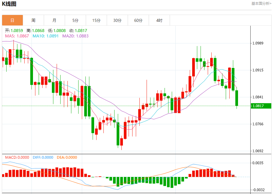 周五盘中,欧元/美元报1.0817,跌幅0.40%。 今日分析:在1.0855之下,看跌,目标价位为1.0790,然后为1.0770。 技术点评:RI技术指标向下运行。 支撑位:1.07901.07701.0760 阻力位:1.08951.08751.0855 (亚汇网编辑:冰凡)