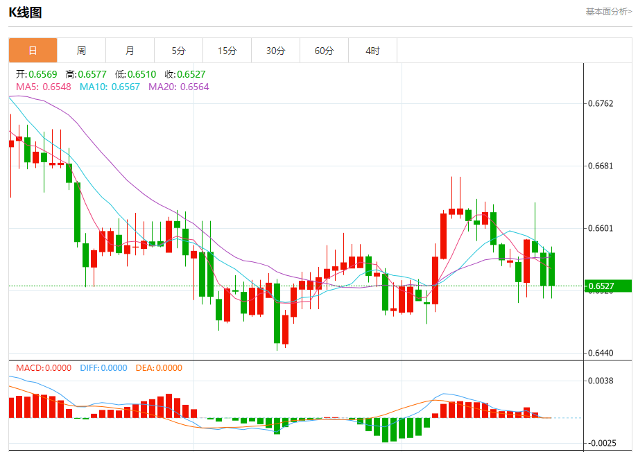 今日周五,澳元兑美元报0.6528,跌幅0.65%;美元兑加元报1.3569,涨幅0.28%;美元兑瑞郎报0.8988,涨幅0.14%。 澳元兑美元汇率分析 技术点评:RI技术指标运行趋势复杂,倾向于下跌。 阻力位:0.65950.65750.6560 支撑位:0.65100.64850.6460 美元