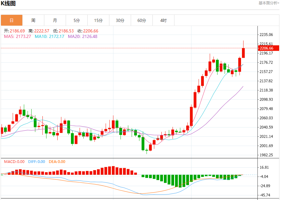 周四盘中,现货黄金报2207.78,涨幅0.99%。 今日分析:在2192.00之上,看涨,目标价位为2222.00,然后为2235.00。 技术点评:在2192.00之上,为多头信号,向上的目标位为2222.00。 支撑位:2192.002178.002165.00 阻力位:2250.002235.002222.00