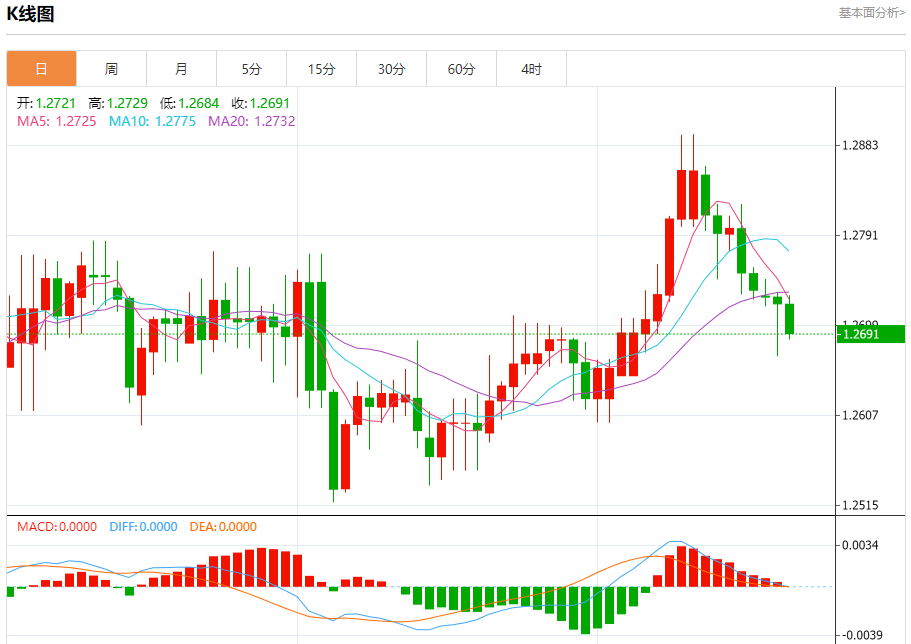 周三盘中,英镑/美元报1.2692,跌幅0.24%。 今日分析:在1.2730之下,看跌,目标价位为1.2685,然后为1.2665。 技术点评:RI技术指标运行趋势复杂,倾向于下跌。 支撑位:1.26851.26651.2645 阻力位:1.27601.27451.2730 (亚汇网编辑:冰凡)