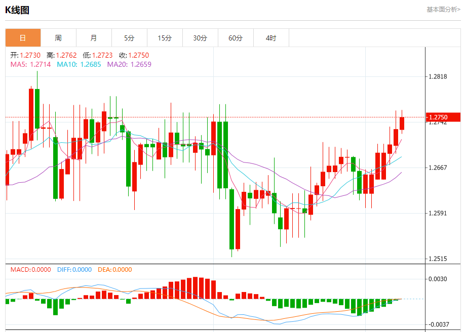 周四盘中,英镑/美元报1.2750,涨幅0.15%。 今日分析:在1.2720之上,看涨,目标价位为1.2760,然后为1.2780。 技术点评:RI技术指标运行趋势复杂,倾向于上涨。 支撑位:1.27201.27051.2690 阻力位:1.28001.27801.2760 (亚汇网编辑:冰凡)