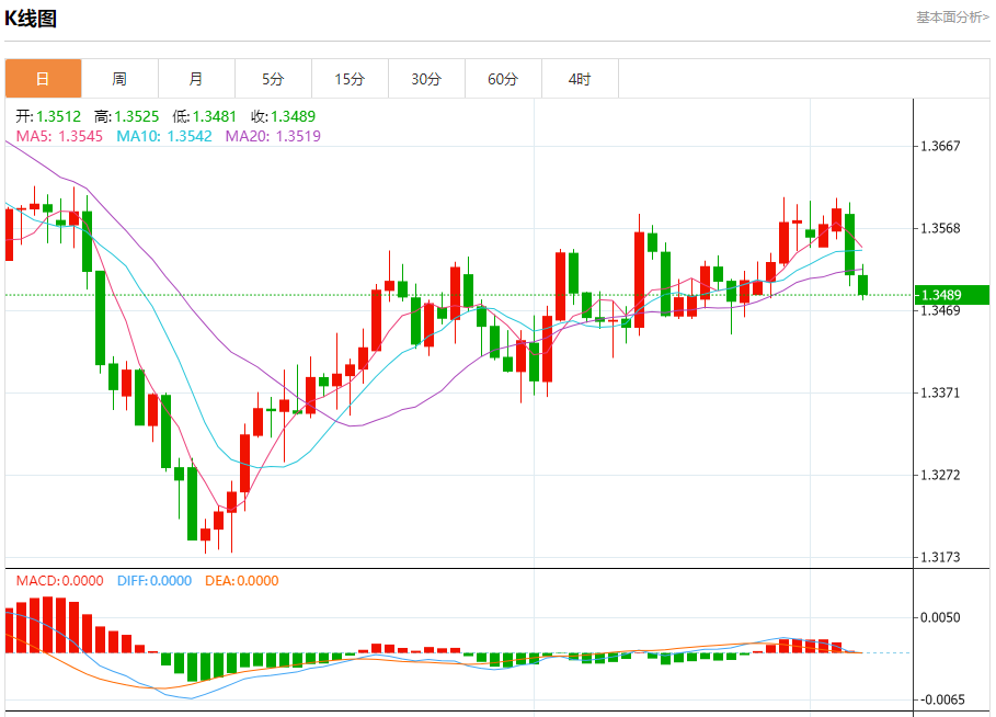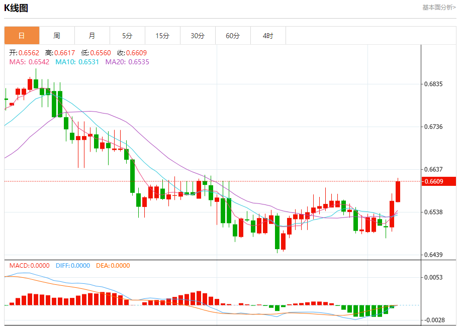 今日周四,澳元兑美元报0.6610,涨幅0.69%;美元兑加元报1.3490,跌幅0.18%;美元兑瑞郎报0.8794,跌幅0.31%。 澳元兑美元汇率分析 技术点评:RI技术指标向上运行。 阻力位:0.66700.66400.6620 支撑位:0.65550.65300.6510 美元兑加元汇率分析