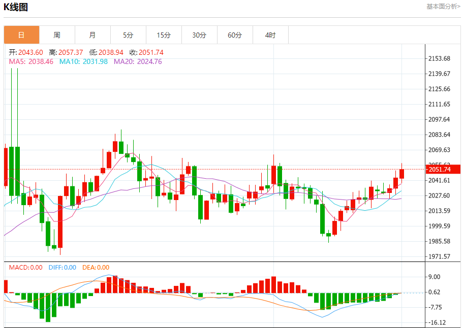 周五盘中,现货黄金报2051.95,涨幅0.39%。 今日分析:在2055.00之上,看涨,目标价位为2074.00,然后为2079.00。 技术点评:在2055.00之上,为多头信号,向上的目标位为2074.00。 支撑位:2055.002047.002040.00 阻力位:2083.002079.002074.00