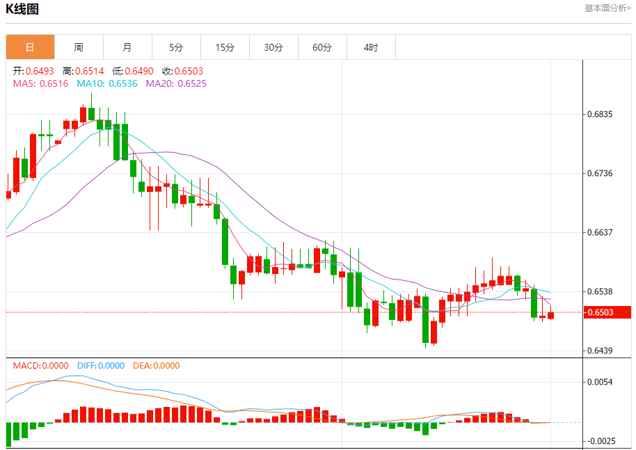 今日周五,澳元兑美元报0.6504,涨幅0.09%;美元兑加元报1.3576,跌幅0.02%;美元兑瑞郎报0.8860,涨幅0.17%。 澳元兑美元汇率分析 技术点评:RI技术指标运行趋势复杂,倾向于上涨。 阻力位:0.65400.65250.6515 支撑位:0.64900.64800.6470 美元