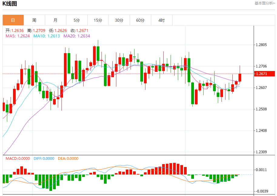 周四盘中,英镑/美元报1.2671,涨幅0.27%。 今日分析:在1.2645之上,看涨,目标价位为1.2710,然后为1.2740。 技术点评:RI技术指标运行趋势复杂,倾向于上涨。 支撑位:1.26451.26151.2600 阻力位:1.27551.27401.2710 (亚汇网编辑:冰凡)