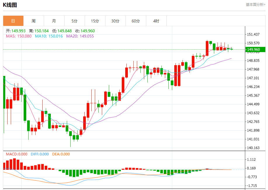 周三盘中,美元/日元报150.018,涨幅0.00%。 今日分析:在149.85之上,看涨,目标价位为150.20,然后为150.30。 技术点评:RI技术指标运行趋势复杂,倾向于上涨。 支撑位:149.85149.70149.50 阻力位:150.45150.30150.20 (亚汇网编辑:冰凡)