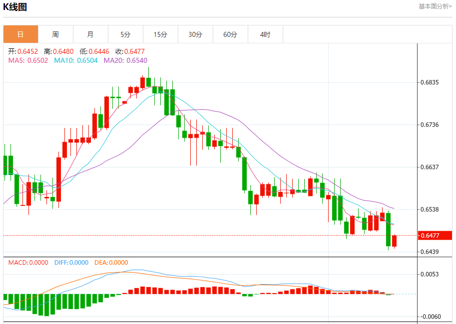 今日周三,澳元兑美元报0.6478,涨幅0.37%;美元兑加元报1.3537,跌幅0.21%;美元兑瑞郎报0.8873,涨幅0.02%。 澳元兑美元汇率分析 技术点评:只要依旧存在0.6480阻力位,价格波动存在看跌的趋势。 阻力位:0.65100.64950.6480 支撑位:0.64400.64150.6400