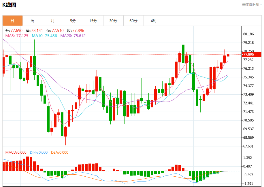 周三盘中,WTI原油报77.894,涨幅0.17%。 今日分析:在77.10之上,看涨,目标价位为78.50,然后为79.00。 技术点评:RI技术指标缺乏下降动能 支撑位:77.1076.6076.10 阻力位:79.3079.0078.50 (亚汇网编辑:冰凡)