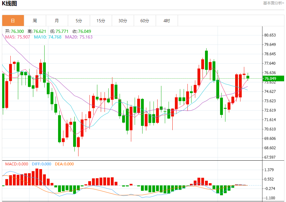 周一盘中,WTI原油报76.031,跌幅0.64%。 今日分析:在75.90之上,看涨,目标价位为77.30,然后为78.10。 技术点评:RI技术指标缺乏下降动能 支撑位:75.9075.2574.60 阻力位:79.0078.1077.30 (亚汇网编辑:冰凡)