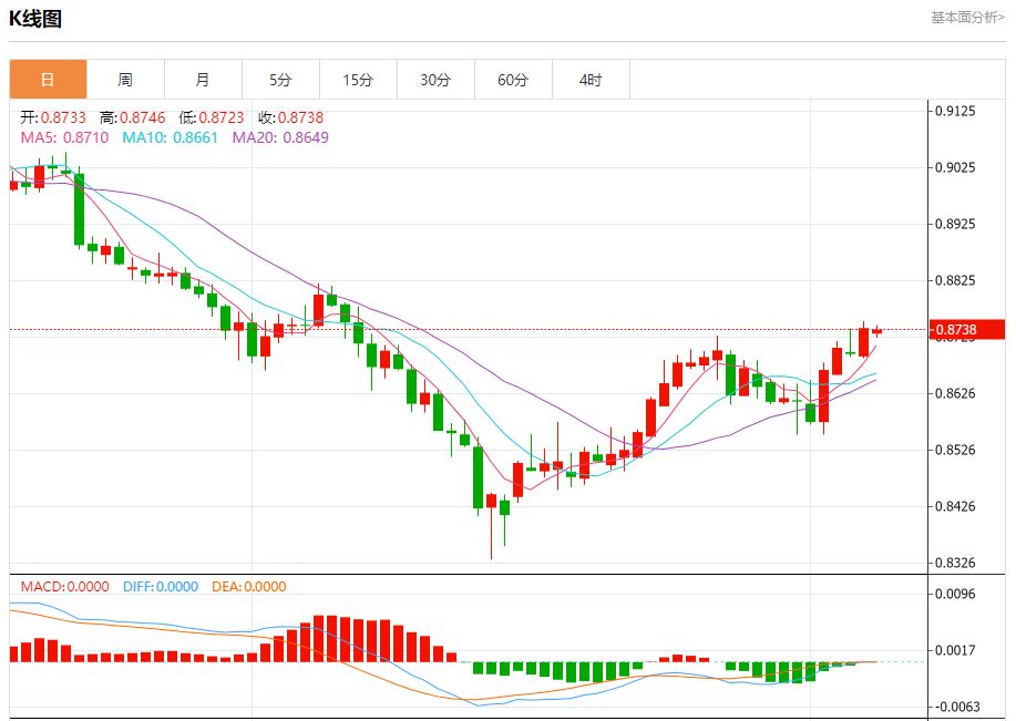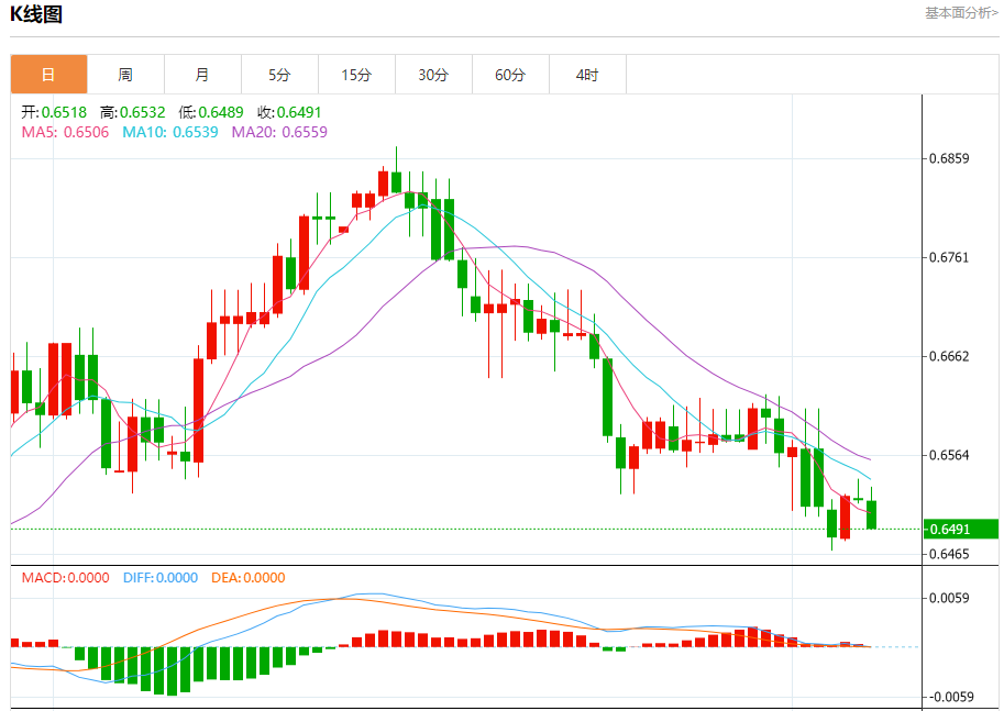 今日周四,澳元兑美元报0.6491,跌幅0.44%;美元兑加元报1.3482,涨幅0.14%;美元兑瑞郎报0.8744,涨幅0.01%。 澳元兑美元汇率分析 技术点评:RI技术指标向下运行。 阻力位:0.65550.65400.6530 支撑位:0.64800.64650.6450 美元兑加元汇率分析