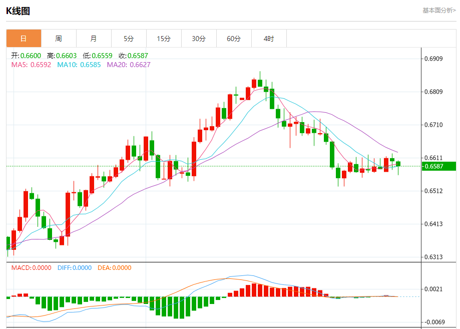 今日周三,澳元兑美元报0.6588,跌幅0.23%;美元兑加元报1.3428,涨幅0.22%;美元兑瑞郎报0.8621,涨幅0.02%。 澳元兑美元汇率分析 技术点评:RI技术指标运行趋势复杂,倾向于下跌。 阻力位:0.66150.66050.6590 支撑位:0.65550.65450.6530 美元