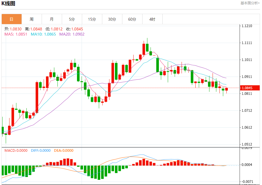 周二盘中,欧元/美元报1.0845,涨幅0.12%。 今日分析:在1.0850之下,看跌,目标价位为1.0810,然后为1.0795。 技术点评:RI技术指标缺乏上升动能 支撑位:1.08101.07951.0780 阻力位:1.08851.08651.0850 (亚汇网编辑:冰凡)