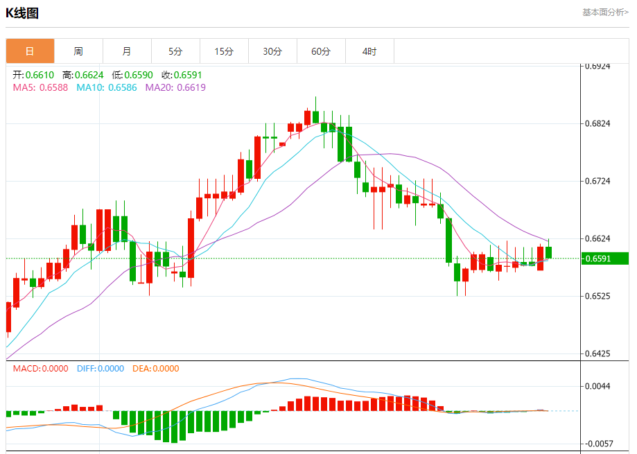 今日周二,澳元兑美元报0.6592,跌幅0.30%;美元兑加元报1.3424,涨幅0.07%;美元兑瑞郎报0.8631,涨幅0.19%。 澳元兑美元汇率分析 技术点评:RI技术指标呈现继续下降趋势。 阻力位:0.66450.66300.6620 支撑位:0.65800.65650.6550 美元兑加元汇