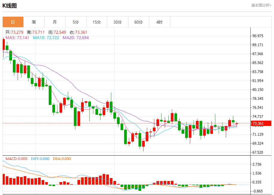 周一盘中,WTI原油报73.529,跌幅0.13%。 今日分析:在73.10之上,看涨,目标价位为74.20,然后为74.60。 技术点评:RI技术指标看涨,有进一步上升空间。 支撑位:73.1072.5572.10 阻力位:75.0074.6074.20 (亚汇网编辑:冰凡)