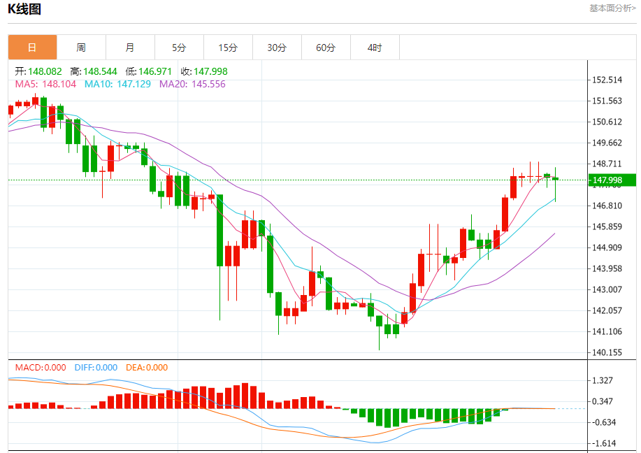 今日周二,截止目前美元兑日元报148.008,下跌0.07%。 日元基本面行情分析 如市场预期,全球“最后的负利率武士”日本央行今日继续“按兵不动”,将基准利率维持在-0.1%不变,将10年期国债收益率目标维持在0%附近。同时,日本央行还维持了对货币政策的前瞻指引,并称将继续实施货币宽松政