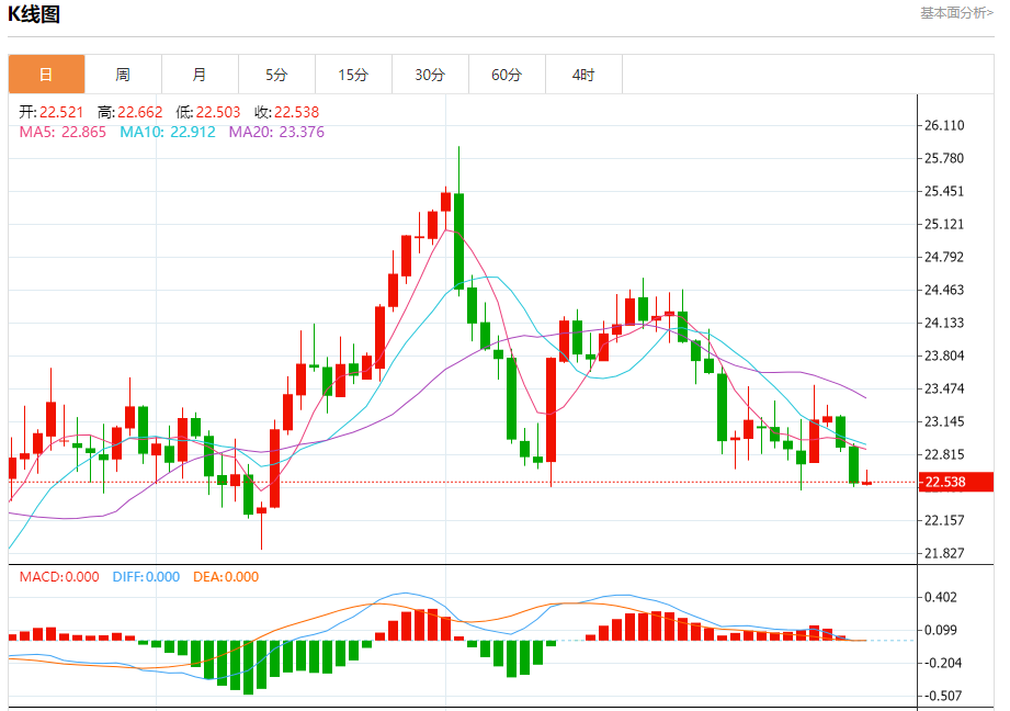 周四盘中,现货白银报22.483,跌幅0.23%。 今日分析:在22.75之下,看跌,目标价位为22.45,然后为22.30。 技术点评:只要22.75阻力位不被突破,向下跌破22.45位置的风险很高。 支撑位:22.4522.3022.15 阻力位:23.0322.8822.75 (亚汇网编辑:冰