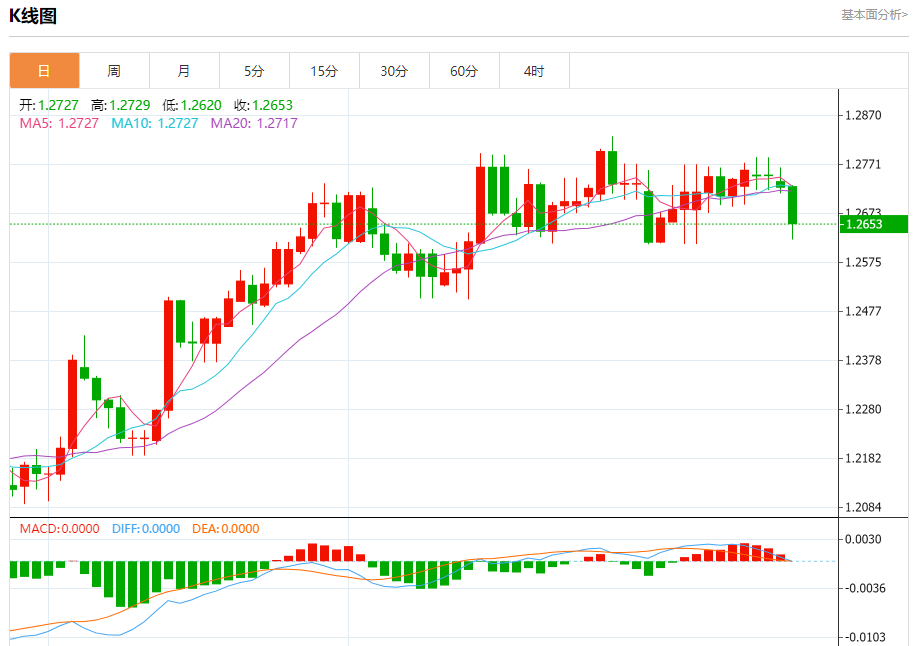 周二盘中,英镑/美元报1.2654,跌幅0.56%。 今日分析:在1.2685之下,看跌,目标价位为1.2605,然后为1.2585。 技术点评:RI技术指标向下运行。 支撑位:1.26051.25851.2570 阻力位:1.27351.27101.2685 (亚汇网编辑:冰凡)